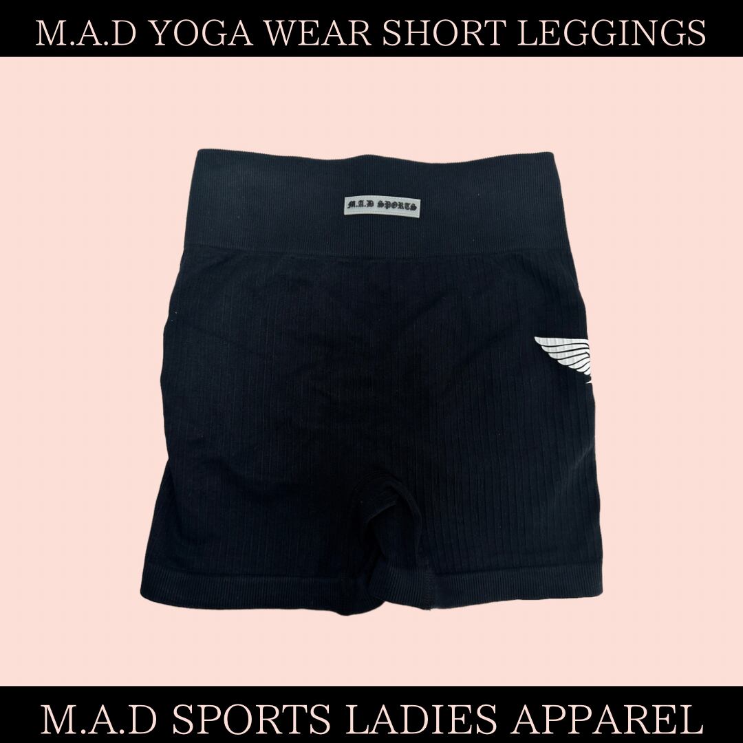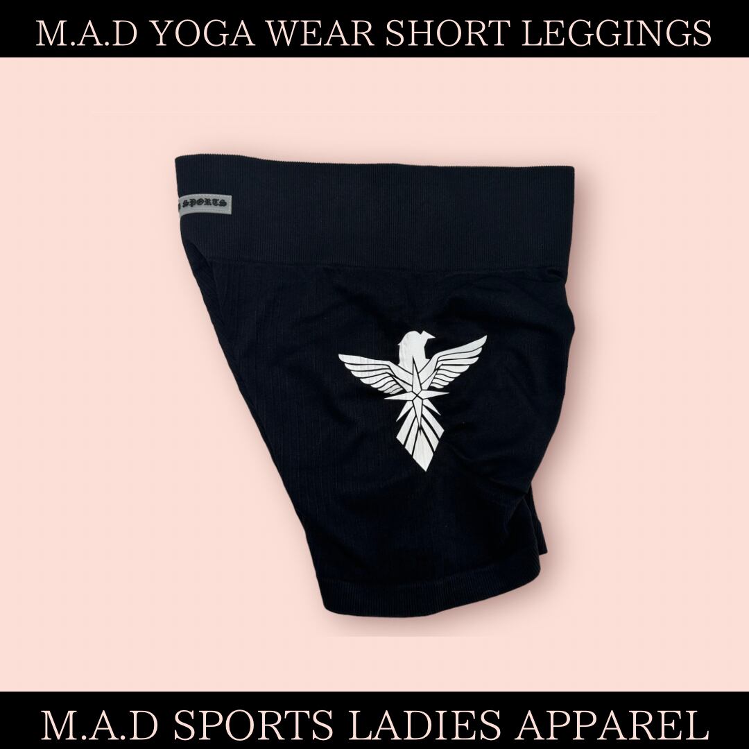 ショートレギンス: ウエスト前面にラバーのM.A.D SPORTSロゴがあり、左外側には大きくM.A.D BIRDロゴがデザインされています!